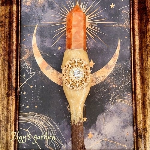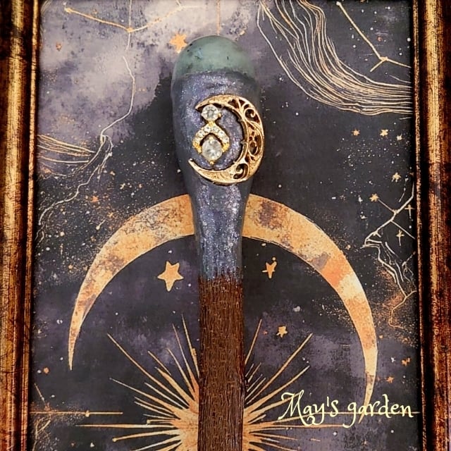 太陽と月にまつわる石をあしらった、温かく力強い杖です。