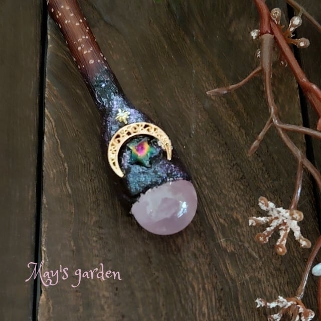 二つのローズクォーツを使った、優美な魔女のワンドです。